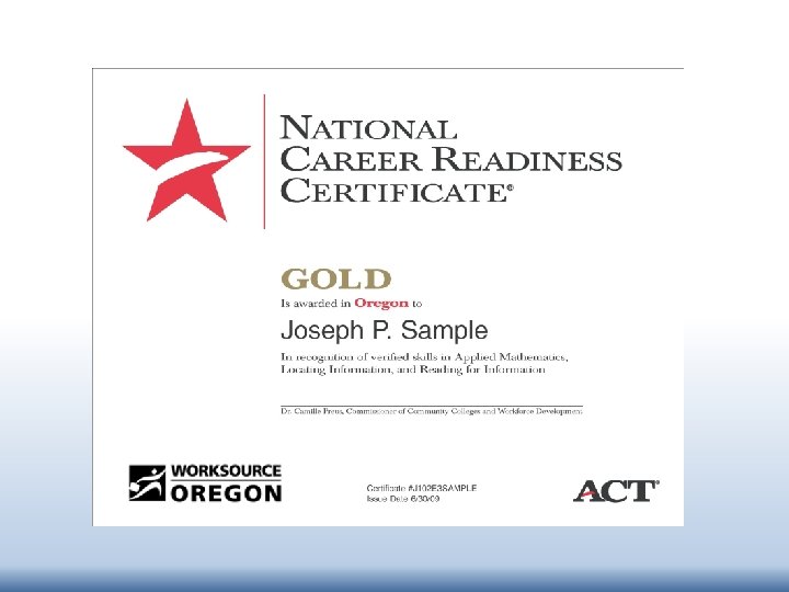Oregon’s National Career Readiness Certificate (NCRC) A nationally recognized, portable certificate A workforce development tool Supported by HB 2398, passed by the Oregon Legislature, federally funded A public-private partnership For skill assessment and certification For recruitment and hiring Used by employers, job applicants and educators