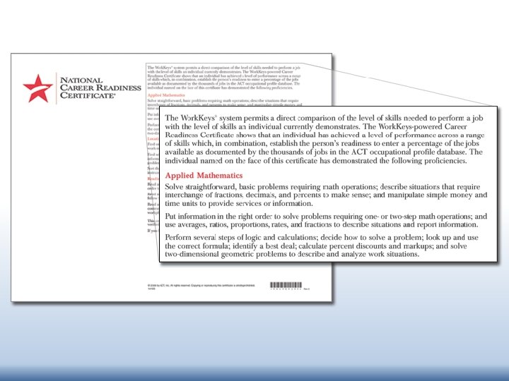 Employer Usage of the NCRC Ask for the certificate. It’s that simple. Add the certificate to all job postings. “We prefer applicants with a National Career Readiness Certificate. ” The certificate, along with other criteria, will be considered as part of the selection process to identify candidates with verified foundational skills. Other criteria include: • • • Prior work experience Education Academic degrees, industry certifications and occupational licenses Reference checks Background checks Interviews ACT does not recommend requiring the NCRC, though some employers may invest in job profiling to address specific needs.