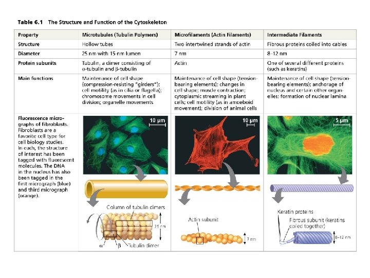 Components of the Cytoskeleton • Three main types of fibers make up the cytoskeleton: – Microtubules are thickest of the three components of the cytoskeleton (tubulin) – Microfilaments, also called actin filaments, are thinnest components – Intermediate filaments are fibers with diameters in a middle range-variable