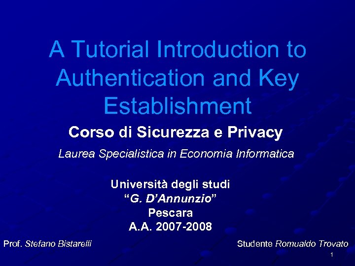 A Tutorial Introduction to Authentication and Key Establishment Corso di Sicurezza e Privacy Laurea Specialistica in Economia Informatica Università degli studi “G. D’Annunzio” Pescara A. A. 2007 -2008 Prof. Stefano Bistarelli Studente Romualdo Trovato 1