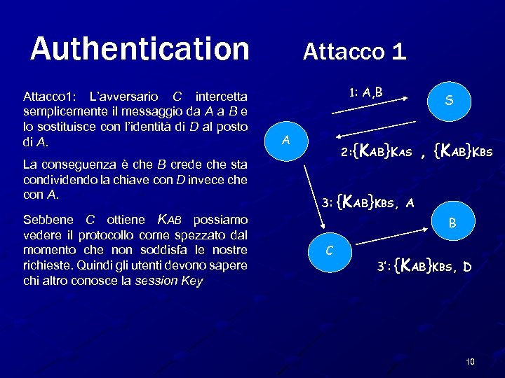 Authentication Problema: Il problema non è che si dà via la chiave segreta KAB. La difficoltà è che le informazioni non sono protetti da terze parti che hanno la chiave. Gli avversari sono in grado non solo a origliare sui messaggi spediti ma anche di catturare i messaggi e di alterarli. 1: A, B A 3: 2: {KAB}KAS {KAB}KBS, S , {KAB}KBS A Security Assumption 2 : Gli avversari possono alterare tutti i messaggi spediti in un cryptographic protocol usando qualsiasi informazione disponibile. In aggiunta l’avversario può cambiare rotta di qualsiasi messaggio verso altri utenti. Questo include l’abilità di generare e inserire completamente nuovi messaggi. B 9