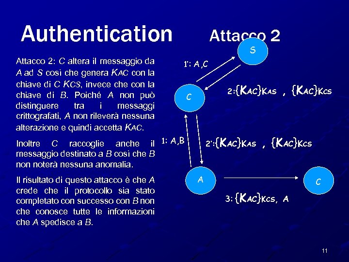 Authentication Attacco 1: L’avversario C intercetta semplicemente il messaggio da A a B e lo sostituisce con l’identità di D al posto di A. La conseguenza è che B crede che sta condividendo la chiave con D invece che con A. Sebbene C ottiene KAB possiamo vedere il protocollo come spezzato dal momento che non soddisfa le nostre richieste. Quindi gli utenti devono sapere chi altro conosce la session Key Attacco 1 1: A, B A S 2: {KAB}KAS 3: {KAB}KBS, , {KAB}KBS A B C 3’: {KAB}KBS, D 10