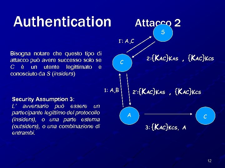 Authentication Attacco 2: C altera il messaggio da A ad S così che genera KAC con la chiave di C KCS, invece che con la chiave di B. Poiché A non può distinguere tra i messaggi crittografati, A non rileverà nessuna alterazione e quindi accetta KAC. Attacco 2 S 1’: A, C 2: {KAC}KAS C 2’: {KAC}KAS Inoltre C raccoglie anche il 1: A, B messaggio destinato a B così che B non noterà nessuna anomalia. Il risultato di questo attacco è che A crede che il protocollo sia stato completato con successo con B non che conosce tutte le informazioni che A spedisce a B. , {KAC}KCS A C 3: {KAC}KCS, A 11