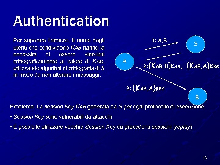 Authentication Attacco 2 S 1’: A, C Bisogna notare che questo tipo di attacco può avere successo solo se C è un utente legittimato e conosciuto da S (insiders) 2: {KAC}KAS C 2’: {KAC}KAS 1: A, B Security Assumption 3: L’ avversario può essere un partecipante legittimo del protocollo (insiders), o una parte esterna (outsiders), o una combinazione di entrambi. , {KAC}KCS A C 3: {KAC}KCS, A 12