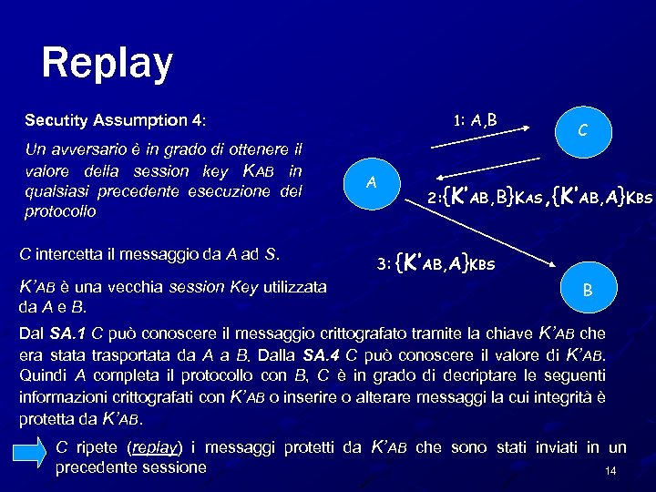 Authentication Per superare l’attacco, il nome degli utenti che condividono KAB hanno la necessità di essere vincolati crittograficamente al valore di KAB, utilizzando algoritmi di crittografia di S in modo da non alterare i messaggi. 1: A, B A 3: 2: {KAB, B}KAS, S {KAB, A}KBS B Problema: La session Key KAB generata da S per ogni protocollo di esecuzione. • Session Key sono vulnerabili da attacchi • È possibile utilizzare vecchie Session Key da precedenti sessioni (replay) 13