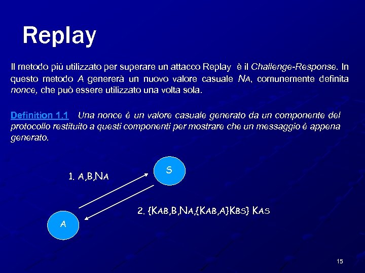 Replay Il metodo più utilizzato per superare un attacco Replay è il Challenge-Response. In questo metodo A genererà un nuovo valore casuale NA, comunemente definita nonce, che può essere utilizzato una volta sola. Definition 1. 1 Una nonce è un valore casuale generato da un componente del protocollo restituito a questi componenti per mostrare che un messaggio è appena generato. 1. A, B, NA S 2. {KAB, B, NA, {KAB, A}KBS} KAS A 15