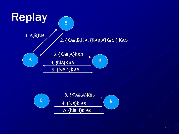 Replay 1. A, B, NA S 2. {KAB, B, NA, {KAB, A}KBS } KAS 3. {KAB, A}KBS A 4. {NB}KAB B 5. {NB-1}KAB C 3. {K’AB, A}KBS 4. {NB}K’AB B 5. {NB-1}K’AB 16
