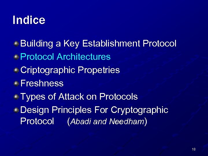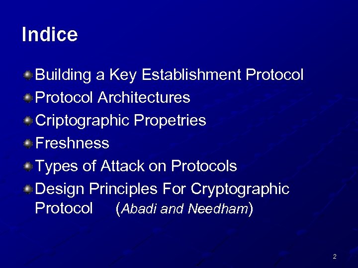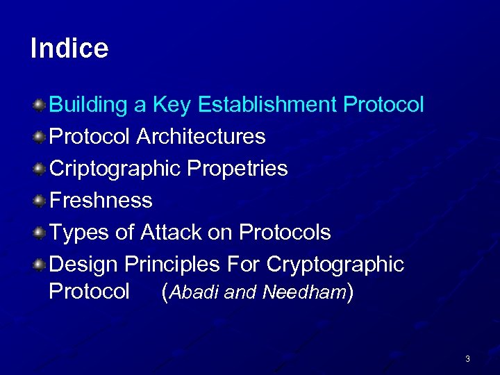 Indice Building a Key Establishment Protocol Architectures Criptographic Propetries Freshness Types of Attack on Protocols Design Principles For Cryptographic Protocol (Abadi and Needham) 2