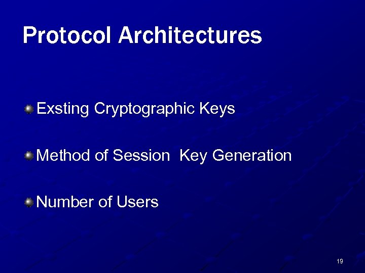 Protocol Architectures Exsting Cryptographic Keys Method of Session Key Generation Number of Users 19