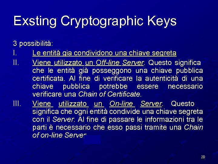 Exsting Cryptographic Keys 3 possibilità: I. Le entità gia condividono una chiave segreta II. Viene utilizzato un Off-line Server. Questo significa che le entità già posseggono una chiave pubblica certificata. Al fine di verificare la autenticità di una chiave pubblica potrebbe essere necessario verificare una Chain of Certificate. III. Viene utilizzato un On-line Server. Questo significa che ogni entità condivide una chiave segreta con il Server. Al fine di passare le informazioni tra le parti è necessario che esso passi tramite una Chain of on-line Server. 20