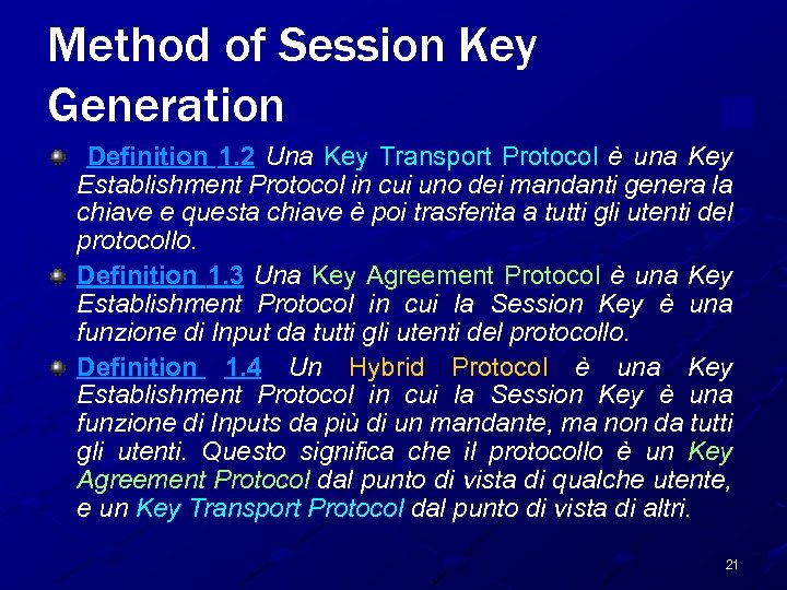 Method of Session Key Generation Definition 1. 2 Una Key Transport Protocol è una Key Establishment Protocol in cui uno dei mandanti genera la chiave e questa chiave è poi trasferita a tutti gli utenti del protocollo. Definition 1. 3 Una Key Agreement Protocol è una Key Establishment Protocol in cui la Session Key è una funzione di Input da tutti gli utenti del protocollo. Definition 1. 4 Un Hybrid Protocol è una Key Establishment Protocol in cui la Session Key è una funzione di Inputs da più di un mandante, ma non da tutti gli utenti. Questo significa che il protocollo è un Key Agreement Protocol dal punto di vista di qualche utente, e un Key Transport Protocol dal punto di vista di altri. 21