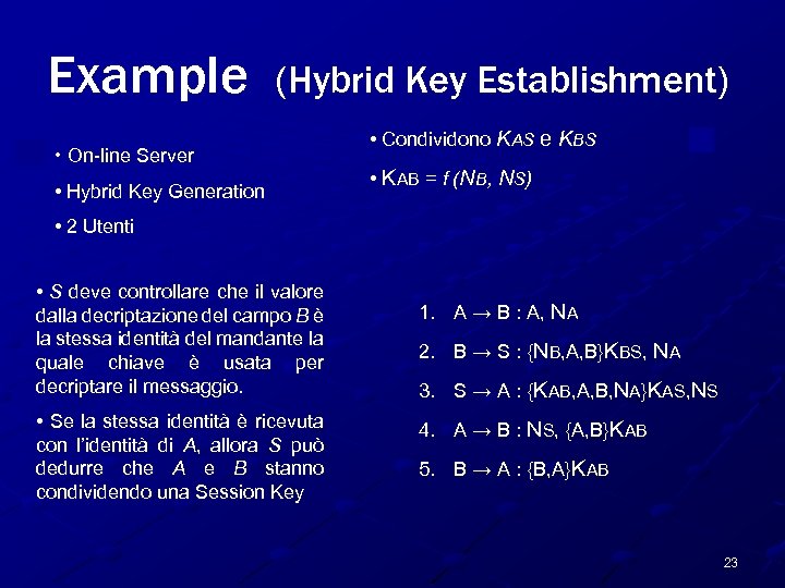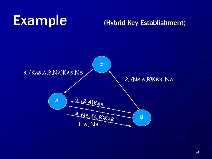 Example (Hybrid Key Establishment) • On-line Server • Hybrid Key Generation • Condividono KAS e KBS • KAB = f (NB, NS) • 2 Utenti • S deve controllare che il valore dalla decriptazione del campo B è la stessa identità del mandante la quale chiave è usata per decriptare il messaggio. • Se la stessa identità è ricevuta con l’identità di A, allora S può dedurre che A e B stanno condividendo una Session Key 1. A → B : A, NA 2. B → S : {NB, A, B}KBS, NA 3. S → A : {KAB, A, B, NA}KAS, NS 4. A → B : NS, {A, B}KAB 5. B → A : {B, A}KAB 23