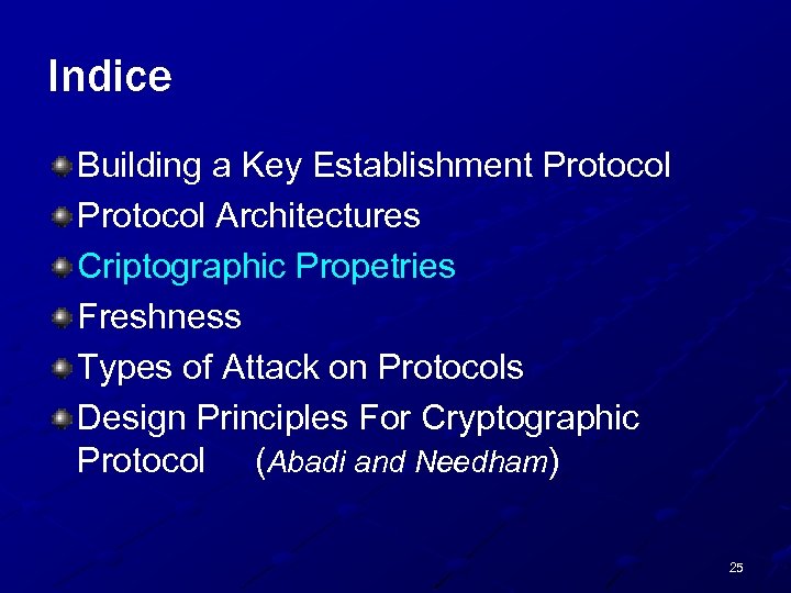 Indice Building a Key Establishment Protocol Architectures Criptographic Propetries Freshness Types of Attack on Protocols Design Principles For Cryptographic Protocol (Abadi and Needham) 25