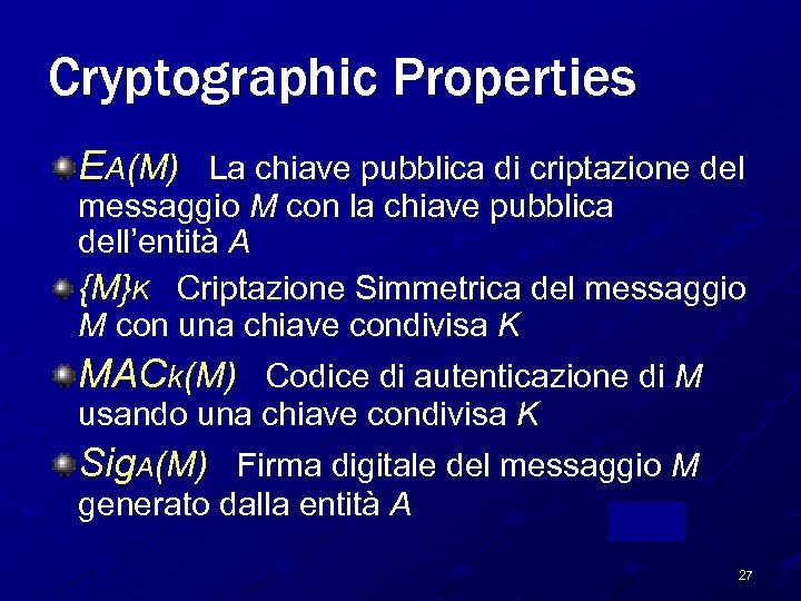 Cryptographic Properties EA(M) La chiave pubblica di criptazione del messaggio M con la chiave pubblica dell’entità A {M}K Criptazione Simmetrica del messaggio M con una chiave condivisa K MACk(M) Codice di autenticazione di M usando una chiave condivisa K Sig. A(M) Firma digitale del messaggio M generato dalla entità A 27