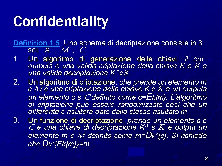 Confidentiality Definition 1. 5 Uno schema di decriptazione consiste in 3 set: K , M , C 1. Un algoritmo di generazione delle chiavi, il cui outputs è una valida criptazione della chiave K є K e una valida decriptazione K-1єK 2. Un algoritmo di criptazione, che prende un elemento m є M e una criptazione della chiave K є K e un outputs un elemento c є C definito come c=Ek{m}. L’algoritmo di criptazione può essere randomizzato così che un differente c risulterà dato dallo stesso risultato m 3. Un funzione di decriptazione, prende un elemento c є C e una chiave di decriptazione K-1 є K e output un elemento m є M definito come m=Dk-1{c}. Si richiede che Dk-1{Ek{m}}=m 28