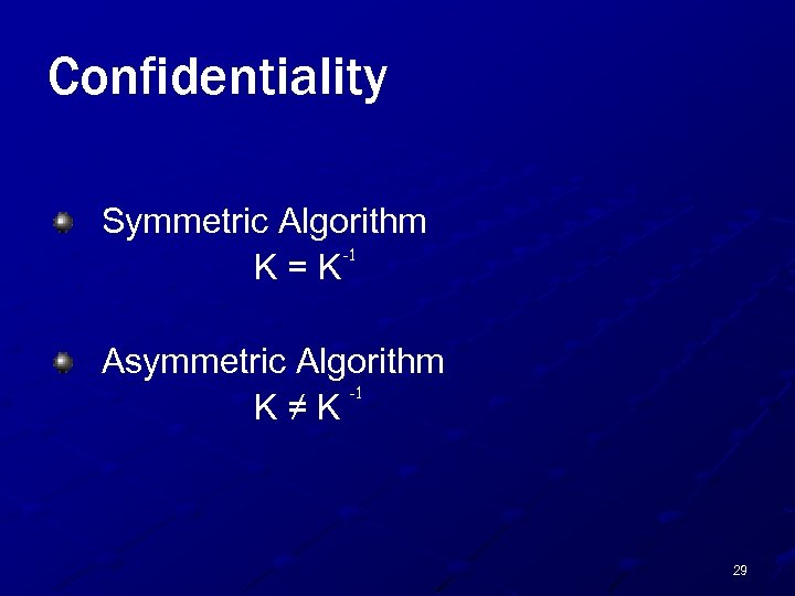 Confidentiality Symmetric Algorithm -1 K=K Asymmetric Algorithm -1 K≠K 29