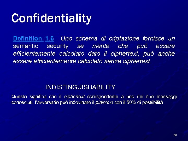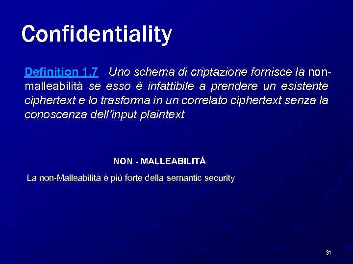 Confidentiality Definition 1. 6 Uno schema di criptazione fornisce un semantic security se niente che può essere efficientemente calcolato dato il ciphertext, può anche essere efficientemente calcolato senza ciphertext. INDISTINGUISHABILITY Questo significa che il ciphertext corrispondente a uno dei due messaggi conosciuti, l’avversario può indovinare il plaintext con il 50% di possibilità 30