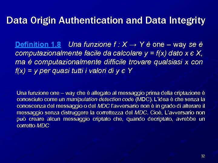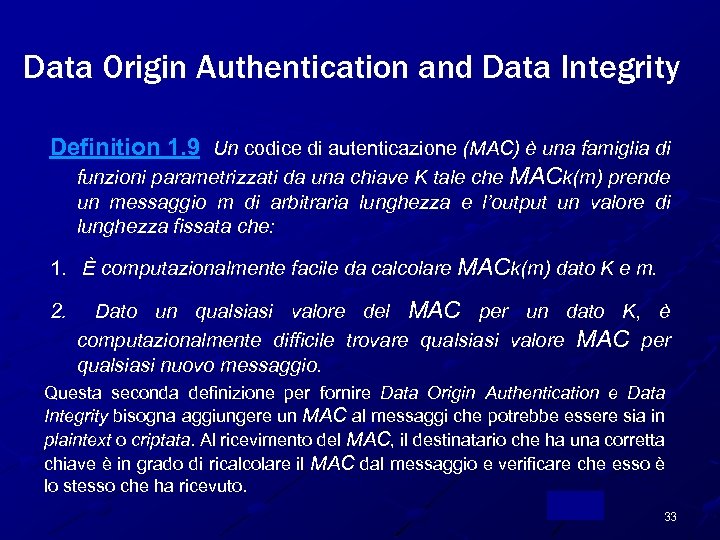 Data Origin Authentication and Data Integrity Definition 1. 8 Una funzione f : X → Y è one – way se è computazionalmente facile da calcolare y = f(x) dato x є X, ma è computazionalmente difficile trovare qualsiasi x con f(x) = y per quasi tutti i valori di y є Y Una funzione – way che è allegato al messaggio prima della criptazione è conosciuto come un manipulation detection code (MDC). L’idea è che senza la conoscenza del messaggio o del MDC l’avversario non è in grado di alterare il messaggio senza distruggere la correttezza del MDC. Cioè, L’avversario non può creare alcun messaggio criptato che, quando decriptato, avrebbe un corretto MDC 32