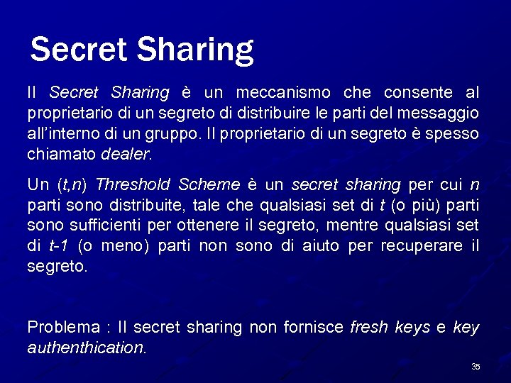 Secret Sharing Il Secret Sharing è un meccanismo che consente al proprietario di un segreto di distribuire le parti del messaggio all’interno di un gruppo. Il proprietario di un segreto è spesso chiamato dealer. Un (t, n) Threshold Scheme è un secret sharing per cui n parti sono distribuite, tale che qualsiasi set di t (o più) parti sono sufficienti per ottenere il segreto, mentre qualsiasi set di t-1 (o meno) parti non sono di aiuto per recuperare il segreto. Problema : Il secret sharing non fornisce fresh keys e key authenthication. 35
