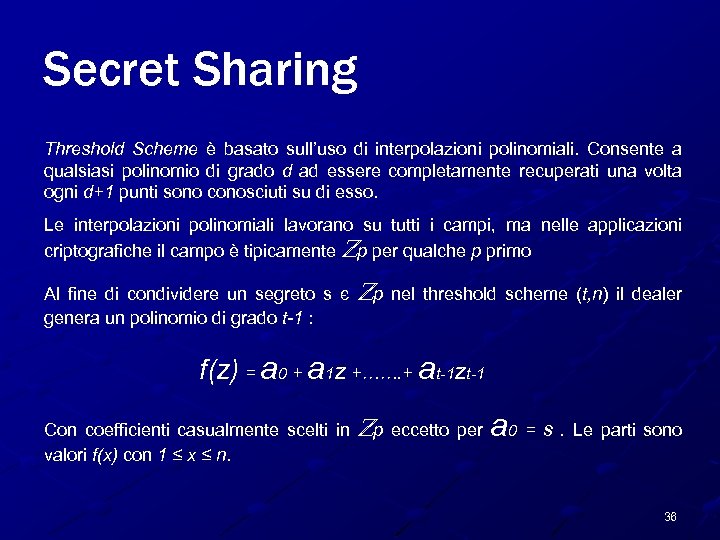 Secret Sharing Threshold Scheme è basato sull’uso di interpolazioni polinomiali. Consente a qualsiasi polinomio di grado d ad essere completamente recuperati una volta ogni d+1 punti sono conosciuti su di esso. Le interpolazioni polinomiali lavorano su tutti i campi, ma nelle applicazioni criptografiche il campo è tipicamente Zp per qualche p primo Al fine di condividere un segreto s є genera un polinomio di grado t-1 : Zp nel threshold scheme (t, n) il dealer f(z) = a 0 + a 1 z +……. + at-1 zt-1 Con coefficienti casualmente scelti in valori f(x) con 1 ≤ x ≤ n. Zp eccetto per a 0 = s. Le parti sono 36
