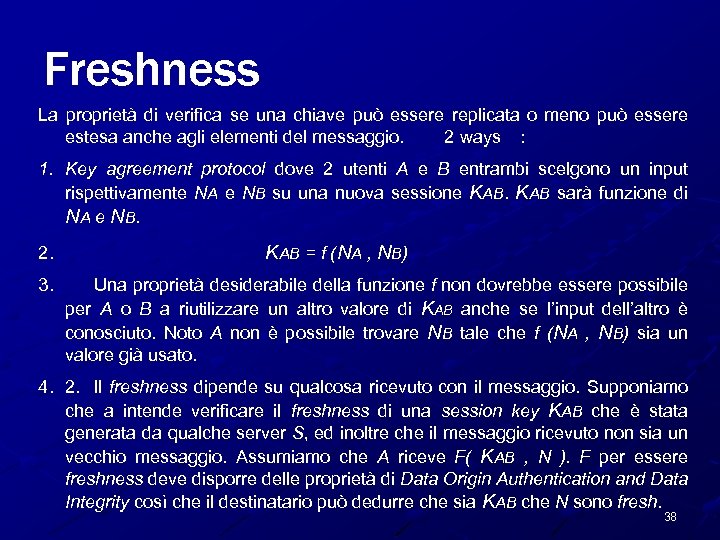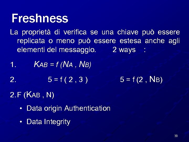 Freshness La proprietà di verifica se una chiave può essere replicata o meno può essere estesa anche agli elementi del messaggio. 2 ways : 1. 2. KAB = f (NA , NB) 5=f(2, 3) 5 = f (2 , NB) 2. F (KAB , N) • Data origin Authentication • Data Integrity 39