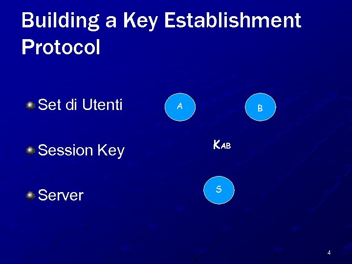 Building a Key Establishment Protocol Set di Utenti Session Key Server A B KAB S 4