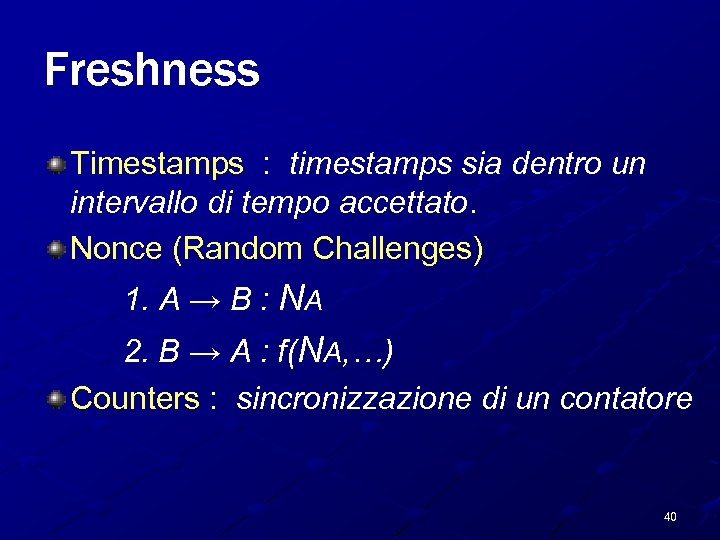 Freshness Timestamps : timestamps sia dentro un intervallo di tempo accettato. Nonce (Random Challenges) 1. A → B : NA 2. B → A : f(NA, …) Counters : sincronizzazione di un contatore 40