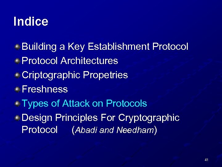 Indice Building a Key Establishment Protocol Architectures Criptographic Propetries Freshness Types of Attack on Protocols Design Principles For Cryptographic Protocol (Abadi and Needham) 41