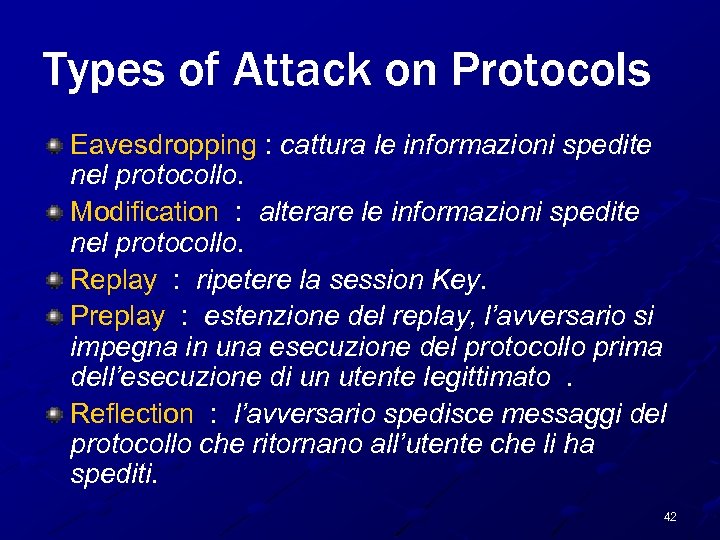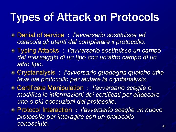 Types of Attack on Protocols Eavesdropping : cattura le informazioni spedite nel protocollo. Modification : alterare le informazioni spedite nel protocollo. Replay : ripetere la session Key. Preplay : estenzione del replay, l’avversario si impegna in una esecuzione del protocollo prima dell’esecuzione di un utente legittimato. Reflection : l’avversario spedisce messaggi del protocollo che ritornano all’utente che li ha spediti. 42