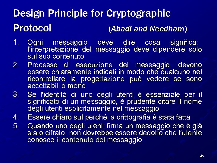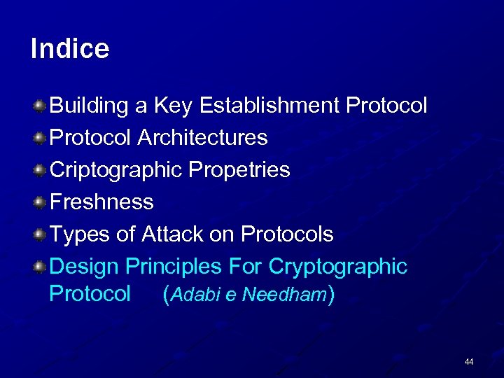 Indice Building a Key Establishment Protocol Architectures Criptographic Propetries Freshness Types of Attack on Protocols Design Principles For Cryptographic Protocol (Adabi e Needham) 44
