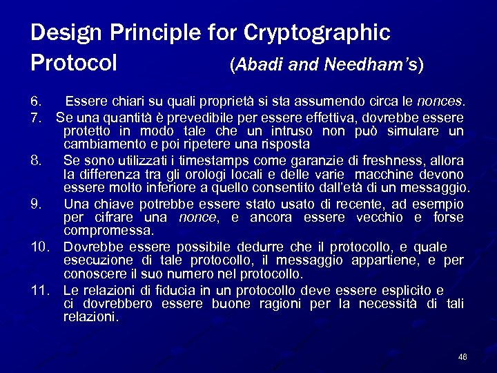 Design Principle for Cryptographic Protocol (Abadi and Needham’s) 6. Essere chiari su quali proprietà si sta assumendo circa le nonces. 7. Se una quantità è prevedibile per essere effettiva, dovrebbe essere protetto in modo tale che un intruso non può simulare un cambiamento e poi ripetere una risposta 8. Se sono utilizzati i timestamps come garanzie di freshness, allora la differenza tra gli orologi locali e delle varie macchine devono essere molto inferiore a quello consentito dall’età di un messaggio. 9. Una chiave potrebbe essere stato usato di recente, ad esempio per cifrare una nonce, e ancora essere vecchio e forse compromessa. 10. Dovrebbe essere possibile dedurre che il protocollo, e quale esecuzione di tale protocollo, il messaggio appartiene, e per conoscere il suo numero nel protocollo. 11. Le relazioni di fiducia in un protocollo deve essere esplicito e ci dovrebbero essere buone ragioni per la necessità di tali relazioni. 46