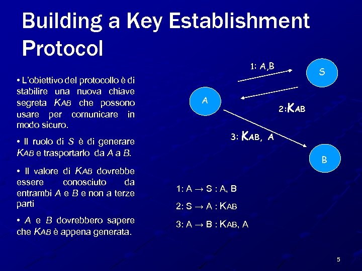 Building a Key Establishment Protocol 1: A, B • L’obiettivo del protocollo è di stabilire una nuova chiave segreta KAB che possono usare per comunicare in modo sicuro. • Il ruolo di S è di generare KAB e trasportarlo da A a B. A S 2: KAB 3: KAB, A B • Il valore di KAB dovrebbe essere conosciuto da entrambi A e B e non a terze parti 1: A → S : A, B • A e B dovrebbero sapere che KAB è appena generata. 3: A → B : KAB, A 2: S → A : KAB 5