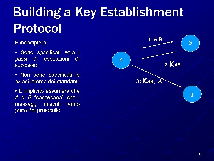 Building a Key Establishment Protocol 1: A, B È incompleto: • Sono specificati solo i passi di esecuzioni di successo. • Non sono specificati le azioni interne dei mandanti. • È implicito assumere che A e B “conoscono” che i messaggi ricevuti fanno parte del protocollo A S 2: KAB 3: KAB, A B 6