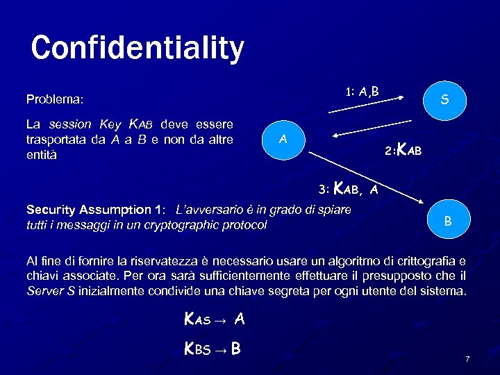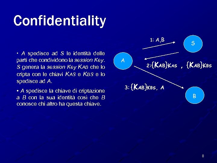 Confidentiality 1: A, B Problema: La session Key KAB deve essere trasportata da A a B e non da altre entità A S 2: KAB 3: KAB, Security Assumption 1: L’avversario è in grado di spiare tutti i messaggi in un cryptographic protocol A B Al fine di fornire la riservatezza è necessario usare un algoritmo di crittografia e chiavi associate. Per ora sarà sufficientemente effettuare il presupposto che il Server S inizialmente condivide una chiave segreta per ogni utente del sistema. KAS → A KBS → B 7