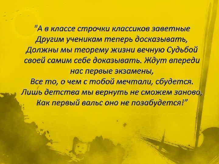 "А в классе строчки классиков заветные Другим ученикам теперь досказывать, Должны мы теорему жизни вечную Судьбой своей самим себе доказывать. Ждут впереди нас первые экзамены, Все то, о чем с тобой мечтали, сбудется. Лишь детства мы вернуть не сможем заново, Как первый вальс оно не позабудется!”