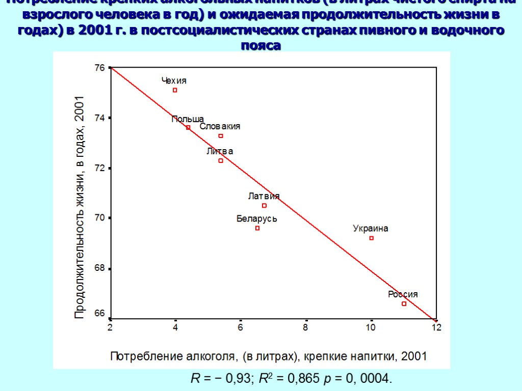 Потребление крепких алкогольных напитков (в литрах чистого спирта на взрослого человека в год) и ожидаемая продолжительность жизни в годах) в 2001 г. в постсоциалистических странах пивного и водочного пояса R = − 0,93; R2 = 0,865 p = 0, 0004.
