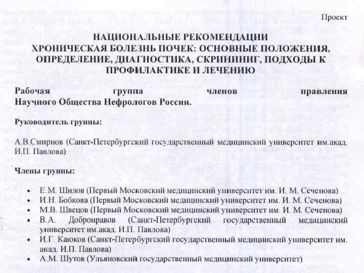 А. В. Смирнов, В. А. Добронравов Роль ассоциаций нефрологических общественных организаций в разработке национальных рекомендпций в нефрологии НИИ Нефрологии С. -Петербургского медицинского университета им. акад. И. П. Павлова Национальная конференция по состоянию и перспективам развития нефрологической помощи в Российской Федерации 1 декабря 2011 г. , Москва