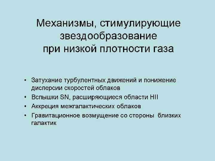 Режим низкой плотности (периферия дисков, S 0 -галактики) Звездообразование происходит: • • при наличии локальных неоднородностей При наличии газовых спиральных ветвей При не полном затухании турбулентных движений При внешнем воздействии на галактику (аккреция, мержинг, гравитационное возмущение) Звездообразование в этих случаях обусловлено факторами, приводящими к локальному сжатию газа •