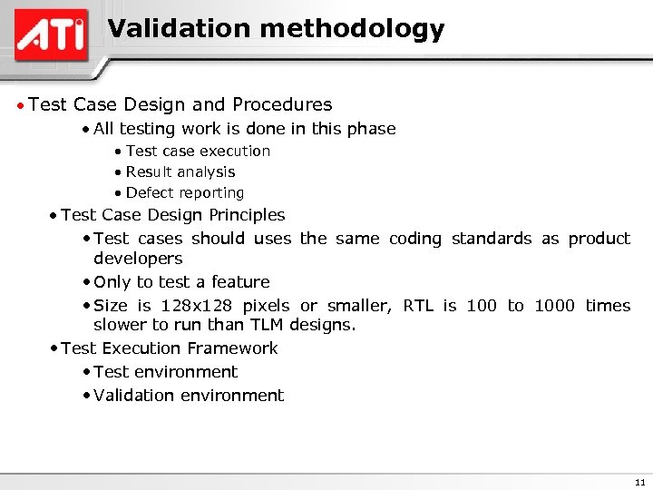 Validation methodology · Test Case Design and Procedures · All testing work is done in this phase · Test case execution · Result analysis · Defect reporting · Test Case Design Principles • Test cases should uses the same coding standards as product developers • Only to test a feature • Size is 128 x 128 pixels or smaller, RTL is 100 to 1000 times slower to run than TLM designs. • Test Execution Framework • Test environment • Validation environment 11