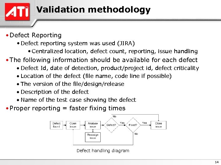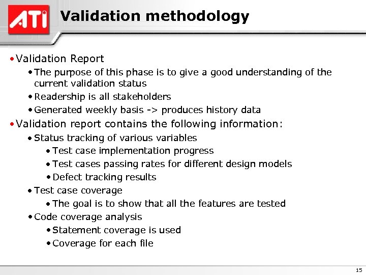 Validation methodology • Defect Reporting • Defect reporting system was used (JIRA) • Centralized location, defect count, reporting, issue handling • The following information should be available for each defect · Defect Id, date of detection, product/project id, defect criticality · Location of the defect (file name, code line if possible) · The version of the file/design/release · Description of the defect · Name of the test case showing the defect • Proper reporting = faster fixing times Defect handling diagram 14