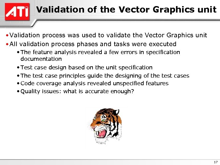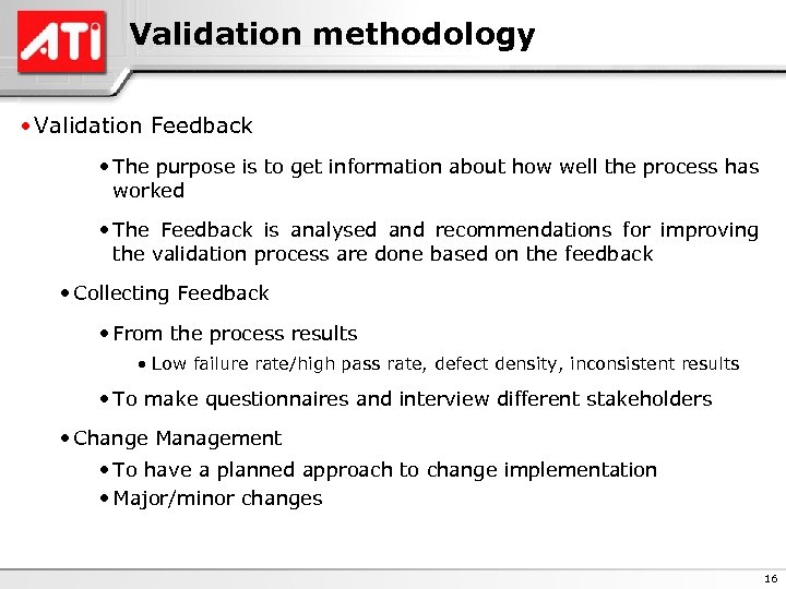 Validation methodology • Validation Report • The purpose of this phase is to give a good understanding of the current validation status • Readership is all stakeholders • Generated weekly basis -> produces history data • Validation report contains the following information: · Status tracking of various variables · Test case implementation progress · Test cases passing rates for different design models • Defect tracking results · Test case coverage · The goal is to show that all the features are tested • Code coverage analysis • Statement coverage is used • Coverage for each file 15