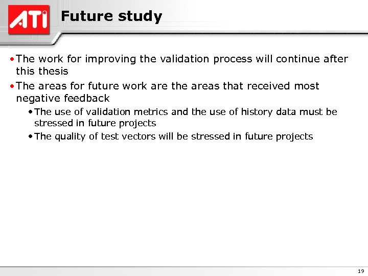 Conclusions • Importance of the validation was realised • Written process for the validation of the graphics processor with documentation templates • Predictability of the validation process was improved due the validation reporting and proper planning • No major rework was made in the project • Defects found in TLM after validation dropped from 30% -> 5% • There is now real history data to be used in the future projects • The documented progress increased confidence towards the product 18