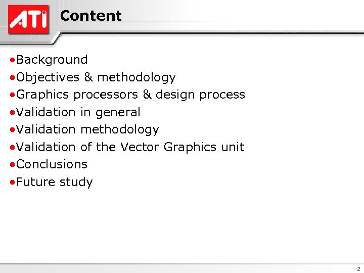 Content • Background • Objectives & methodology • Graphics processors & design process • Validation in general • Validation methodology • Validation of the Vector Graphics unit • Conclusions • Future study 2