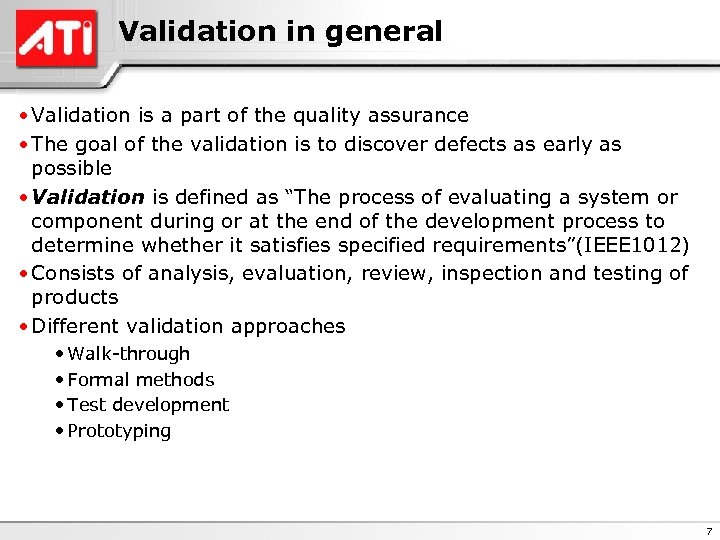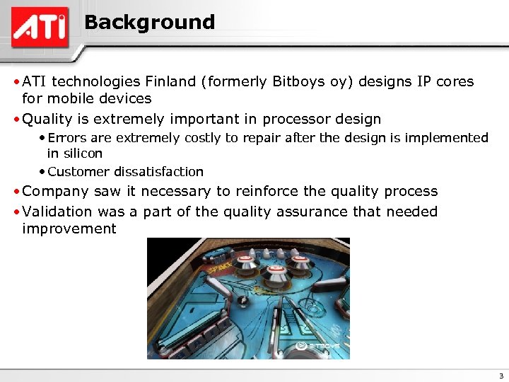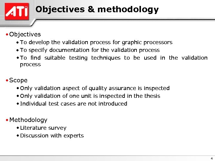 Background • ATI technologies Finland (formerly Bitboys oy) designs IP cores for mobile devices • Quality is extremely important in processor design • Errors are extremely costly to repair after the design is implemented in silicon • Customer dissatisfaction • Company saw it necessary to reinforce the quality process • Validation was a part of the quality assurance that needed improvement 3