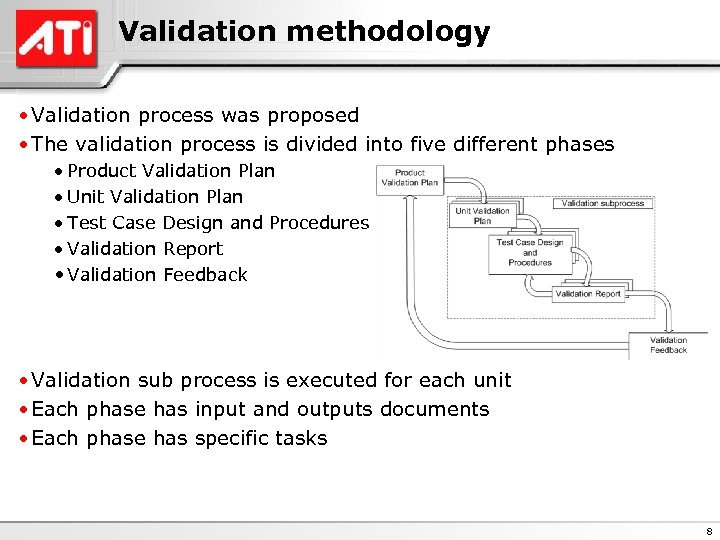 Validation in general • Validation is a part of the quality assurance • The goal of the validation is to discover defects as early as possible • Validation is defined as “The process of evaluating a system or component during or at the end of the development process to determine whether it satisfies specified requirements”(IEEE 1012) • Consists of analysis, evaluation, review, inspection and testing of products • Different validation approaches • Walk-through • Formal methods • Test development • Prototyping 7