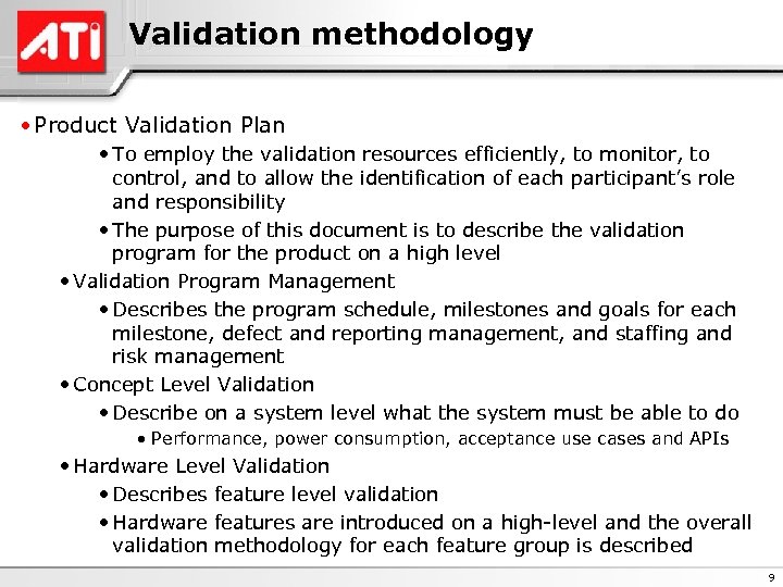 Validation methodology • Validation process was proposed • The validation process is divided into five different phases · Product Validation Plan · Unit Validation Plan · Test Case Design and Procedures · Validation Report • Validation Feedback • Validation sub process is executed for each unit • Each phase has input and outputs documents • Each phase has specific tasks 8