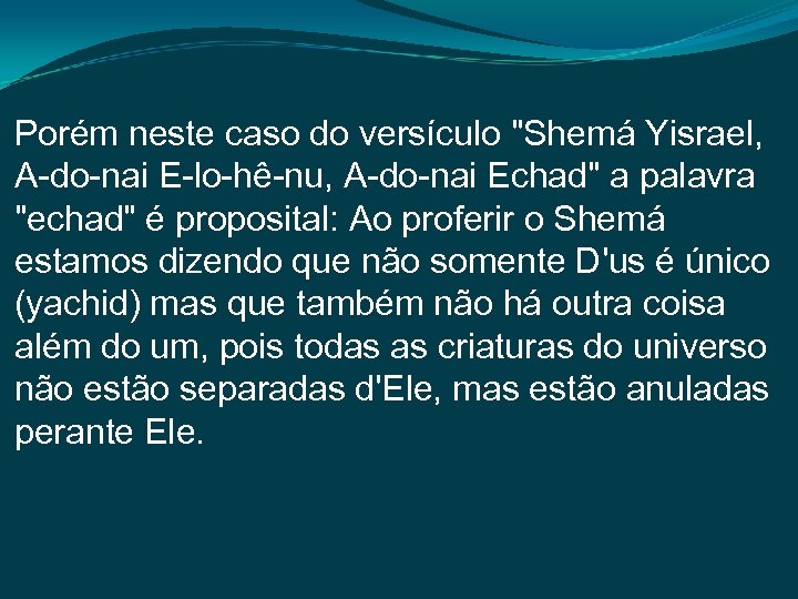 Sendo assim, devemos dar ênfase especial na última palavra do Shemá, refletir sobre seu significado, e perceber como toda a criação está anulada perante este Um Único. Fonte: http: //www. chabad. org. br/interativo/FAQ/shema. html ECHAD = אחד Echad é uma palavra hebraica que corresponde a palavra UM na língua portuguesa. http: //pt. wikipedia. org/wiki/Echad