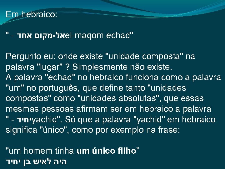 Em hebraico: " - אל-מקום אחד el-maqom echad" Pergunto eu: onde existe "unidade composta" na palavra "lugar" ? Simplesmente não existe. A palavra "echad" no hebraico funciona como a palavra "um" no português, que define tanto "unidades compostas" como "unidades absolutas", que essas mesmas pessoas afirmam ser em hebraico a palavra " - יחיד yachid". Só que a palavra "yachid" em hebraico significa "único", como por exemplo na frase: "um homem tinha um único filho” היה לאיש בן יחיד