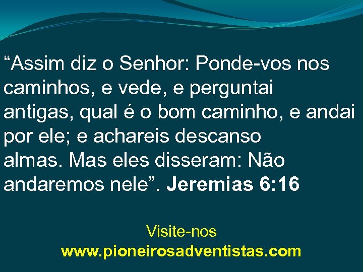 “Assim diz o Senhor: Ponde-vos nos caminhos, e vede, e perguntai antigas, qual é o bom caminho, e andai por ele; e achareis descanso almas. Mas eles disseram: Não andaremos nele”. Jeremias 6: 16 Visite-nos www. pioneirosadventistas. com
