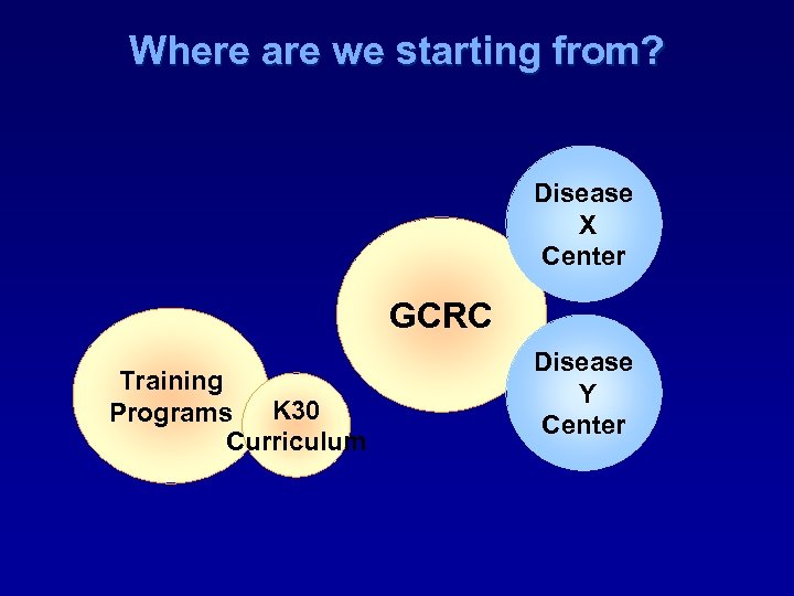 Where are we starting from? Disease X Center GCRC Training Programs K 30 Curriculum Disease Y Center